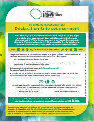 Les avocats du recours collectif (Gowling WLG) peuvent fournir une aide juridique gratuite, pour demander un réexamen et pour faire une demande auprès de d’évaluateur indépendant. Les avocats du recours collectif sont disponibles au 1-844-539-3815 ou à l’adresse courriel DaySchools@GowlingWLG.com.
